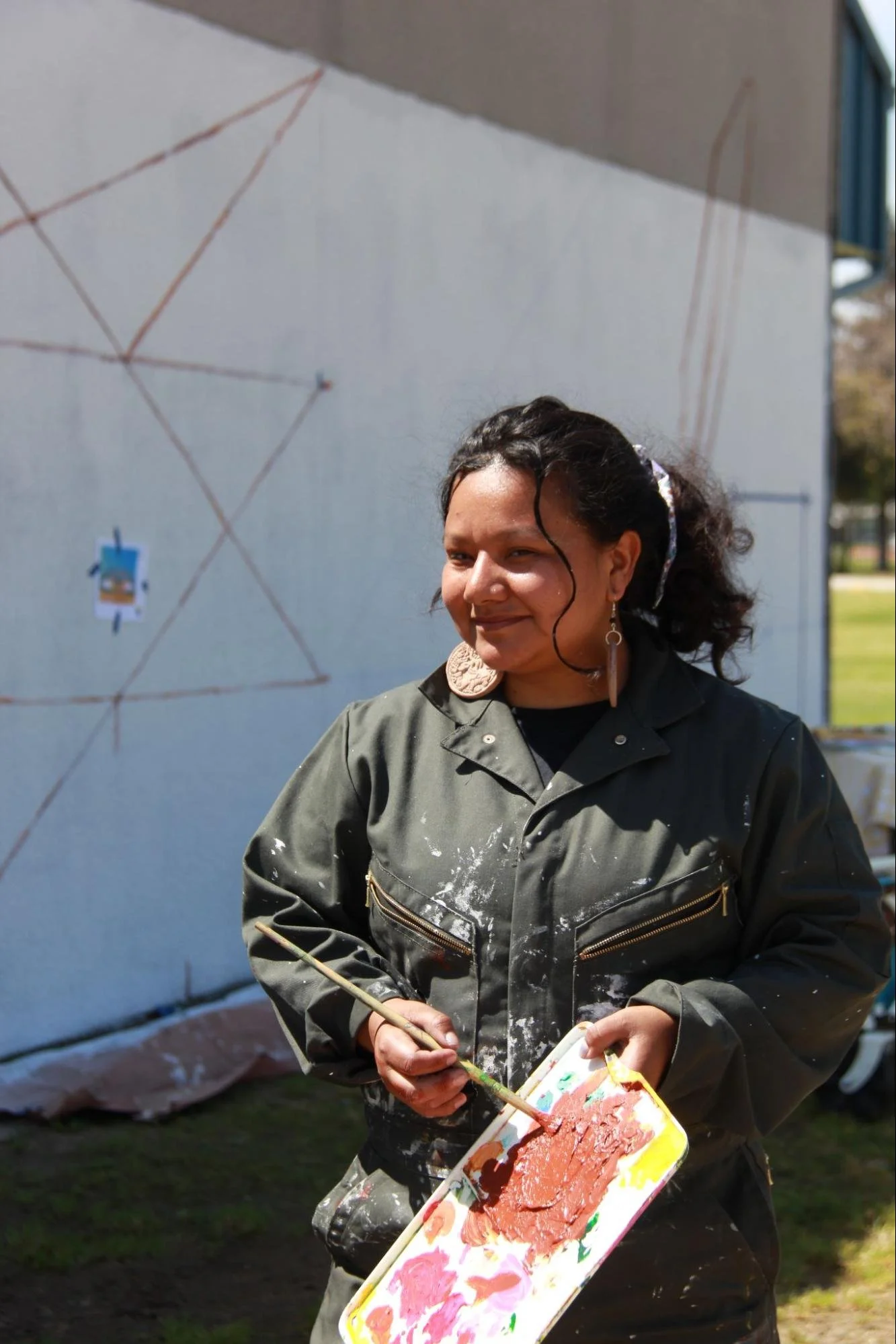 Merced-based visual artist Jazz Diaz (she/her) explores community and personal healing through murals, printmaking, illustration, and digital art. Her work reflects her Salvadoran heritage and her journey to reconnect with the ancestral land and culture of her parents from El Salvador.